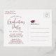 Announce a high school or college graduation and invite family and friends to the party with custom 3 photo collage burgundy and gold foil invitation postcards. All pictures and wording are simple to personalise and the colours are easy to change with the Zazzle design tool. This template is set up as a combination announcement card and party invitation that can be customised with any details of your choice, such as parents' names, special honours, degree title, favourite inspirational quote, graduate's future plans or new address. The dark red, white and gold design features a mortar board cap, modern trendy script calligraphy, elegant minimalist typography, and three favourite photos, such as senior pictures or images from the commencement ceremony. This graduation postcard is a stylish way to announce a special day celebration. Congratulations to the graduate!