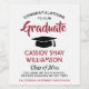 Add a personalised touch to college or high school graduation party decorations with these elegant red, white and black wine bottle labels. Design features a white background, black mortar board cap, stylish modern typography, handwritten style script calligraphy, and a customisable message reading "Congratulations to our Graduate". Text at the bottom includes class year, school name, and optional lines for degree, beverage type, or other info. All text is simple to customise. These labels make a stylish graduation party drink idea and an elegant addition to the graduate's special day celebration. Cheers!