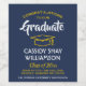 Add a personalized touch to college or high school graduation party decorations with these elegant navy blue, white and yellow gold wine bottle labels. Design features a dark blue background, yellow mortar board cap, stylish modern typography, handwritten style script calligraphy, and a customizable message reading "Congratulations to our Graduate". Text at the bottom includes class year, school name, and optional lines for degree, beverage type, or other info. All text is simple to customize. These labels make a stylish graduation party drink idea and an elegant addition to the graduate's special day celebration. Cheers!