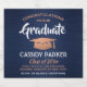 Add a personalised touch to college or high school graduation party decorations with these elegant navy blue, copper and white sparkling wine bottle labels. Design features a faux foil mortar board cap, stylish modern typography, handwritten style script calligraphy, and a customisable message reading "Congratulations to our Graduate". Text at the bottom includes class year, school name, and optional lines for degree, beverage type, or other info. All text is simple to customise. Please note that copper is printed colour, not metallic foil. These labels make a stylish graduation party drink idea and an elegant addition to the graduate's special day celebration. Cheers!