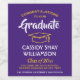 Add a personalised touch to college or high school graduation party decorations with these elegant purple, white and gold yellow wine bottle labels. Design features a purple background, yellow mortar board cap, stylish modern typography, handwritten style script calligraphy, and a customisable message reading "Congratulations to our Graduate". Text at the bottom includes class year, school name, and optional lines for degree, beverage type, or other info. All text is simple to customise. These labels make a stylish graduation party drink idea and an elegant addition to the graduate's special day celebration. Cheers!