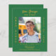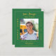 Personalise and add a photo, name, school name, class of, and party details. A forest green background colour, golden text.