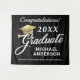 Graduation Party Backdrop. Faux gold foil look with mortarboard cap with varsity style script lettering. Fully customisable -- easily add your own text, change the background colour, text size and style. Trendy but traditional background setting for your graduate's celebration.