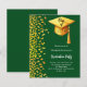 A modern, elegant Graduation party invitation. An emerald green background decorated with faux gold confetti and a large golden graduation cap with tassel. Personalise and add a name and party details. White text.