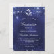 A navy blue background, decorated with faux glitter, sparkles. The blue colour is uneven. Personalise and add a name and party details. The text graduation and the name is written with a modern hand lettered style script.