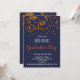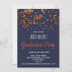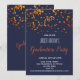 Contemporary trendy orange gold confetti on black graduation party invitation. Customise for your party! Modern script and vintage sans serif contrasting typefaces.