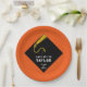 Creative graduation party plates featuring black grad cap and gold tassel design on an orange background. Edit text to add your favourite grad's name and the year.