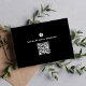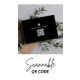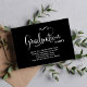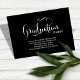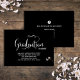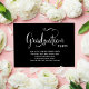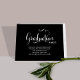 This design features a graduation QR code party invitation insert card, with a modern calligraphy minimalist template, a simple invitation insert, with a black and white calligraphy script typography lettering, with social media Facebook icon for your party event page and details info information details, a grad party information info details, graduate high school or college, party invitation insert card, with a scan scannable QR code details, a gradient gold and black lettering