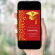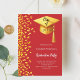 A modern, elegant Graduation party invitation. A red background decorated with faux gold confetti and a large golden graduation cap with tassel. Personalise and add a name and party details. White text.