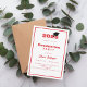 A modern and stylish invitation for a graduation party. For both him and her. White background, red text and a frame. A black graduation cap.