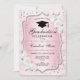 Graduation party invitation. Features damask pattern script font, white roses, tassel and confetti. Elegant pink design with faux glitter silver. Perfect for a stylish celebration.