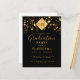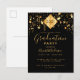 An elegant, simple invitation card for a graduation party for both him and her. A black background and a modern black abstract tassel topper in faux gold with the year inside. Decorated with falling golden stars. Personalise and add a name and party details. The text Graduation and the name are written with modern handlettered style script. Golden coloured text.