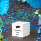 This party favour box is shown in a graduation cap print.