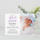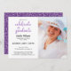 Send out cool, modern, customisable graduation invitations for your graduate's celebration. Replace the sample photo and text with your own to make it unique. Personalise it for any graduate: high school, college, graduate school, law school, medical school, trade school. The invite features the words "celebrate the graduate" in a violet watercolor script font on a white background. The black text colours can be changed by clicking the "Customise" button. On the back, a decorative painted pattern of scrolling white curves meet and diverge on a violet background.