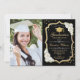 Graduation party invitation with your photo. Features script font, white roses, tassel and confetti. Elegant black, white design with faux glitter gold. Perfect for an elegant celebration.
