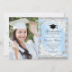 Graduation party invitation with your photo. Features stripes, script font, white roses, tassel and confetti. Elegant turquoise aqua blue design with faux glitter silver. Perfect for an elegant celebration.
