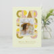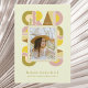 Retro-style, yet modern, graduation announcement photo card that features the word "GRAD" designed with geometric shapes in various colors that form a border around the photo of the graduate. Retro colors—yellow, pink, brown, and green—add to the card's retro style.