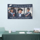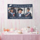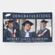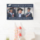 Elegant dark blue graduation party welcome banner and photo backdrop to celebrate the graduate with "Congratulations" in large white typography, an illustration of a graduation cap, a three photo collage and his or her name, class year and school name in modern white typography. The background and text colours can be edited to match your school colours by selecting "customise further."
