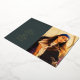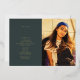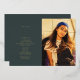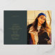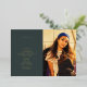Line art "graduation" foil script at left with your custom text.  Photo at right.  Dark emerald green background.