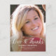 Send an elegant thank you postcard to your family and friends for their graduation gifts to you. This design features your photo on the front with a modern script which reads. "Love & Thanks" in black typography with your name, school, and class/year below to personalise. The back of the card has an illustration of a graduation cap and scroll with a message you may customise. Designed by artist ©Susan Coffey. Photography © Storytree Studios, Stanford, CA.