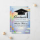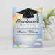 Announce your college graduation to family and friends with this elegant announcement card and party invitation. This modern design template features a black graduation cap on a background of a rainbow and blue sky with your details in black script below. The back of the card has a party invitation for you to customise. Congratulations on your graduation! Designed by artist Tim Coffey.