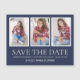 Modern and trendy 4 photo graduation Save the Date magnet card for the Class of 2022 or any year. The front of the card has 3 favourite photos on a navy blue (customisable colour) background, "Save the date," your name, school name, graduation year, graduation date, and location.