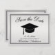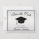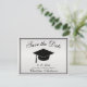 Announce your upcoming graduation in style and have your relatives and friends save the date with this elegant flat card. The design features a faux silver background with the words "Save the Date" in black script. A simple black graduation cap is in the centre and below is the date and your name to personalise. The back of the card has more info for you to customise as well. Designed by artist ©Susan Coffey.