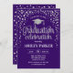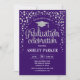 Graduation party invitation for men or women. Elegant invite card in purple and silver. Modern simple design featuring faux glitter confetti, a cap and typography script font. Perfect for a stylish graduation celebration.