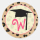 A graduation sticker featuring a leopard print background.  Personalise with your monogram under black graduation cap inside pink circle.