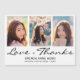 Send a custom photo thank you magnetic card to your family and friends for your graduation. This design template features three of your photos framed in white. Below in black hand lettered script it reads, "Love + Thanks" with your name, school, and year for you to personalise. Designed by artist ©Susan Coffey.