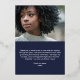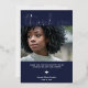 These elegant graduation thank you cards feature two photos of the graduate, with modern silver foil script typography and a silver foil image of a graduation cap and tassel on a dark, navy blue background.