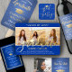 Add an elegant personalised touch to college or high school graduation thank you cards and party favours with blue, white and gold round stickers / envelope seals. All text is simple to customise. Design features a blue faux brushed metallic background, faux foil mortar board cap, and modern calligraphy style script typography. Please note that gold is printed colour, not foil. Congratulations to the graduate!