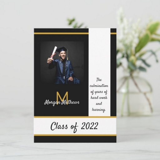 Add your photos and change text to this bold graphic graduation invitation in black white and gold tone.