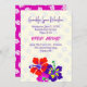 Open house graduation invitation with bold hibiscus flowers design. Perfect for a daughter's graduation from high school. Her name is in purple script at the top with date, school name and class beneath. "Open House" is in bold dark pink with more text beneath for party time and location. Red, purple and pink flowers at the bottom, and background of falling graduation caps, which continues to the reverse over a bright pink background.