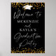 Welcome guests to a graduation party for two graduates (friends or siblings) with a poster sign designed with modern handwritten script typography, orange confetti, white graduation cap or mortarboard with orange tassel and personalised with the graduates' names against a black background. Hang on a wall or door mount on foamboard or frame for a free-standing sign. ASSISTANCE: For help with design modification/personalisation, colour change, transferring the design to another product or if you would like coordinating items, contact the designer BEFORE ORDERING via the Zazzle Chat MESSAGE tab or email at makeitaboutyoustore@gmail.com.