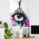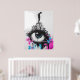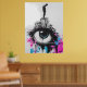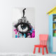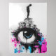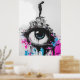 This thought-provoking graffiti-style artwork features a silhouetted figure standing on a cluster of urban buildings with a giant eye, conveying themes of surveillance, isolation, and defiance. The vibrant splashes of pink and blue contrast against the monochrome setting, highlighting the tension between individuality and societal structures. Ideal for those who love urban street art with a deeper message, this piece brings rebellion and bold design to any room.