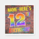 The front of this vibrant, eye-catching and exciting birthday-themed paper napkin design features a custom name, and the message "12TH BIRTHDAY!" with letters having a multicolored rainbow spectrum inspired gradient pattern, on a brick wall inspired pattern background. The look is inspired by that of street art or graffiti drawn on a wall. Fun paper napkins like this might be used at a birthday party being held in honour of somebody’s 12th birthday. [~Z0000367]