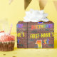 This eye-catching, vibrant and fun birthday-themed wrapping paper design features a custom name, and the message "1ST BIRTHDAY!" with letters having a multicolored rainbow spectrum inspired gradient pattern, on a brick wall inspired pattern background. The style is inspired by that of street art or graffiti drawn on a wall. Wrapping paper like this might be used when wrapping gifts being given to somebody in celebration of their 1st birthday. [~Z0000369]