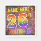 The front of this eye-catching, fun and exciting birthday-themed paper napkin design features a personalised name, and the message "26TH BIRTHDAY!" with letters having a multicolored rainbow spectrum inspired gradient pattern, on a wall-of-bricks inspired pattern background. The look is inspired by that of graffiti or street art drawn on a wall. Fun paper napkins like this might be used at a birthday party for somebody who is celebrating their 26th birthday. [~Z0000367]