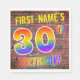 The front of this eye-catching, vibrant and fun birthday-themed paper napkin design features a customisable name, and the message "30TH BIRTHDAY!" with letters having a multicolored rainbow spectrum inspired gradient pattern, on a wall-of-bricks inspired pattern background. The style is inspired by that of street art or graffiti drawn on a wall. Fun paper napkins like this might be used at a birthday party being held in honour of somebody’s thirtieth birthday. [~Z0000367]