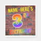 The front of this exciting, vibrant and eye-catching birthday-themed paper napkin design features a customisable name, and the message "3RD BIRTHDAY!" with letters having a multicolored rainbow spectrum inspired gradient pattern, on a wall-of-bricks inspired pattern background. The appearance is inspired by that of street art or graffiti drawn on a wall. Fun paper napkins like this might be used at a birthday party being held to celebrate somebody’s third birthday. [~Z0000367]