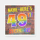 The front of this exciting, fun and eye-catching birthday-themed paper napkin design features a custom name, and the message "49TH BIRTHDAY!" with letters having a multicolored rainbow spectrum inspired gradient pattern, on a wall-of-bricks inspired pattern background. The style is inspired by that of street art or graffiti drawn on a wall. Fun paper napkins like this might be used at a birthday party being held to celebrate somebody’s 49th birthday. [~Z0000367]