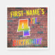 The front of this eye-catching, vibrant and fun birthday-themed paper napkin design features a custom name, and the message "4TH BIRTHDAY!" with letters having a multicolored rainbow spectrum inspired gradient pattern, on a wall-of-bricks inspired pattern background. The appearance is inspired by that of street art or graffiti drawn on a wall. Fun paper napkins like this might be used at a birthday party being held in honour of somebody’s fourth birthday. [~Z0000367]