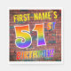 The front of this fun, exciting and eye-catching birthday-themed paper napkin design features a custom name, and the message "51ST BIRTHDAY!" with letters having a multicolored rainbow spectrum inspired gradient pattern, on a wall-of-bricks inspired pattern background. The look is inspired by that of graffiti or street art drawn on a wall. Fun paper napkins like this might be used at a birthday party for somebody who is celebrating their fifty first birthday. [~Z0000367]