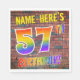 The front of this eye-catching, exciting and fun birthday-themed paper napkin design features a customisable name, and the message "57TH BIRTHDAY!" with letters having a multicolored rainbow spectrum inspired gradient pattern, on a wall-of-bricks inspired pattern background. The style is inspired by that of street art or graffiti drawn on a wall. Fun paper napkins like this might be used at a birthday party being held to celebrate somebody’s 57th birthday. [~Z0000367]