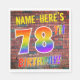 The front of this exciting, vibrant and eye-catching birthday-themed paper napkin design features a personalised name, and the message "78TH BIRTHDAY!" with letters having a multicolored rainbow spectrum inspired gradient pattern, on a wall-of-bricks inspired pattern background. The look is inspired by that of graffiti or street art drawn on a wall. Fun paper napkins like this might be used at a birthday party being held to celebrate somebody’s seventy eighth birthday. [~Z0000367]