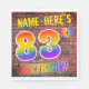 The front of this vibrant, exciting and eye-catching birthday-themed paper napkin design features a personalised name, and the message "83RD BIRTHDAY!" with letters having a multicolored rainbow spectrum inspired gradient pattern, on a wall-of-bricks inspired pattern background. The look is inspired by that of street art or graffiti drawn on a wall. Fun paper napkins like this might be used at a birthday party being held in honour of somebody’s 83rd birthday. [~Z0000367]