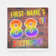 The front of this fun, vibrant and exciting birthday-themed paper napkin design features a custom name, and the message "88TH BIRTHDAY!" with letters having a multicolored rainbow spectrum inspired gradient pattern, on a wall-of-bricks inspired pattern background. The appearance is inspired by that of graffiti or street art drawn on a wall. Fun paper napkins like this might be used at a birthday party being held to commemorate somebody’s eighty eighth birthday. [~Z0000367]