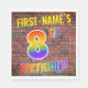 The front of this vibrant, fun and exciting birthday-themed paper napkin design features a customisable name, and the message "8TH BIRTHDAY!" with letters having a multicolored rainbow spectrum inspired gradient pattern, on a wall-of-bricks inspired pattern background. The appearance is inspired by that of street art or graffiti drawn on a wall. Fun paper napkins like this might be used at a birthday party being held in honour of somebody’s eighth birthday. [~Z0000367]