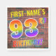 The front of this fun, eye-catching and exciting birthday-themed paper napkin design features a personalised name, and the message "93RD BIRTHDAY!" with letters having a multicolored rainbow spectrum inspired gradient pattern, on a brick wall inspired pattern background. The appearance is inspired by that of street art or graffiti drawn on a wall. Fun paper napkins like this might be used at a birthday party being held to honour somebody who is celebrating their ninety third birthday. [~Z0000367]